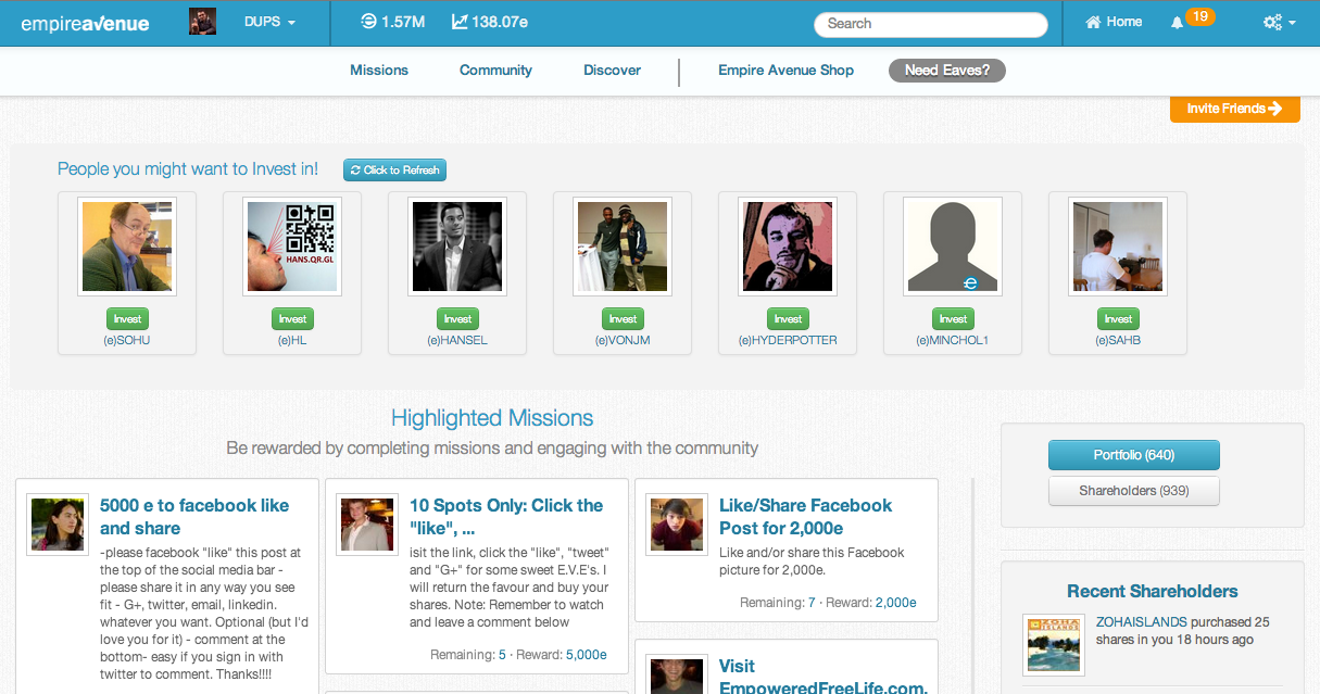 - Engage has been replaced with a relatively new home page which we've had for a couple of weeks, but expect that to be the focus of much attention and updates going forward. The page now features people and missions we have highlighted for you using our algorithms as well as Recent Shareholders, Mentions and Arrivals as before. You can reach this page by clicking "Home" on the top bar, or the Empire Avenue logo.