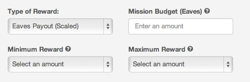 To access: in Mission Reward Type, choose “Eaves Payout (Scaled)” (now the default) when creating a Mission, choose a Eaves Budget, a Minimum Reward and a Maximum Reward.