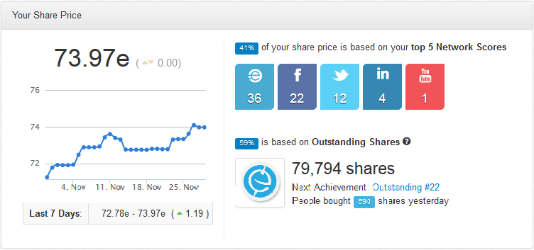 The first thing you will probably notice is the “Your Share Price” box. Your current Share Price is listed in bold print at the top left of the box directly above a graph which shows any fluctuations in your Share Price over the last 7 days. The right side of this box now displays how your Share Price is calculated. Your top five Network scores, and the percentile that they contribute to your Share Price are listed at the top right hand side of the box, and directly underneath that are your Outstanding Shares, along with the percentage that they contribute.