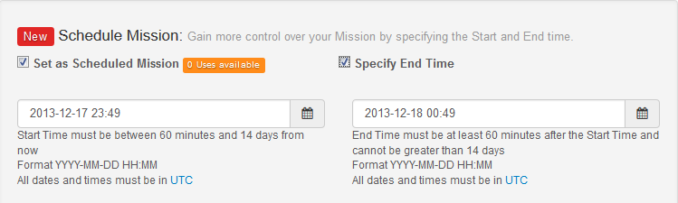 Scheduled Missions will allow Mission Creators to set start, and end times for a Vee, or Eaves Mission! Creating a Scheduled Mission is easy! Simply navigate to the Schedule a Mission menu at the bottom of the Mission Creation page. The minimum amount of time a Mission is allowed to run for is 1 hour if using both Start and End Times.
