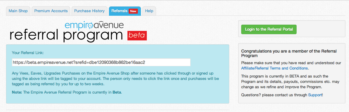 The commission is on any sale of Vees, Eaves and Upgrades in the Shop. The only thing not included is Premium Accounts.  Every purchase of Vees, Eaves and Upgrades will carry a commission to you if you are in our Referral program (commission levels start at 8%). We’re also not talking about just the first purchase from your Referral either. Helping people understand and get more out of Empire Avenue will result in greater commissions for you as we will provide commissions on every sale tagged to your Referral Link! To make it easy, once someone follows your Referral Link, we will tag purchases to you for up to three months! (please note each use of a Referral Link will reset the expiry on the tag, meaning that a Referral can provide commissions much longer than three months!)