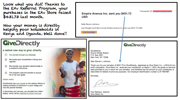 A: In the first month as an Empire Avenue Affiliate I earned $431.73, all of which I donated to the charity Give Directly. Give Directly targets very low-income households in developing countries. They use an innovative mobile phone-linked payment system to direct transfer cash to households in developing countries (currently, Kenya and Uganda). GiveDirectly.org is a top rated charity by GiveWell.org. It excels in these three criteria: (a) serving the global poor, (b) focused on evidence-backed interventions, and (c) thoroughly vetted and highly transparent.