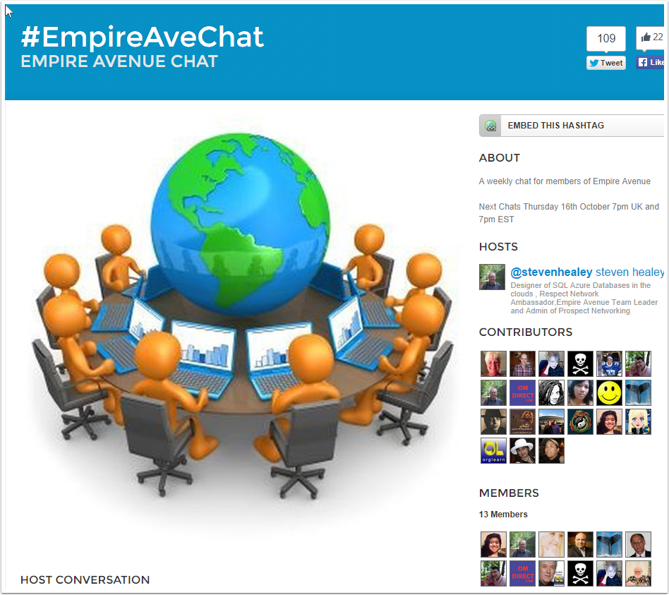 This Thursday sees the third of our Empire Avenue twitter chats and we invite you to join Steven , Erin , Nance ,Dennis , Simon and Michelle for an hour of discussions on Social Media.